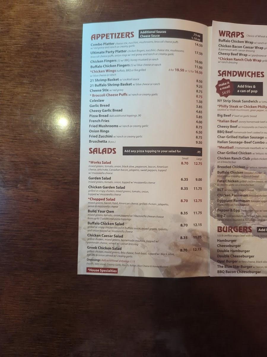 The American Dinners section showcases comfort food, including the Chicken Tender Dinner, Fried Shrimp Dinner, and the indulgent BBQ Baby Back Ribs Dinner. If you're craving something from the grill, you can try one of their burgers, such as the Opa! Burger or the Blue Star Burger. Wraps like the Buffalo Chicken Wrap and Cheesy Beef Wrap provide great options for a quick, tasty meal.