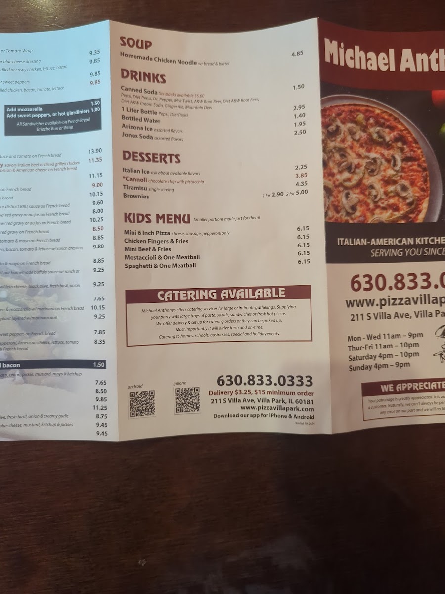The menu at Michael Anthony's, located at 211 S Villa Ave, Villa Park, IL, offers a wide variety of delicious dishes catering to different tastes, from classic Italian meals to hearty American favorites. For the little ones, the Kids Menu features several tasty options like the Kid's Mini Beef And Fries, Kid's Mostaccioli And Meatball, Kid's Spaghetti And Meatball, and Kid's Mini 6" Pizza, ensuring a fun dining experience for children.